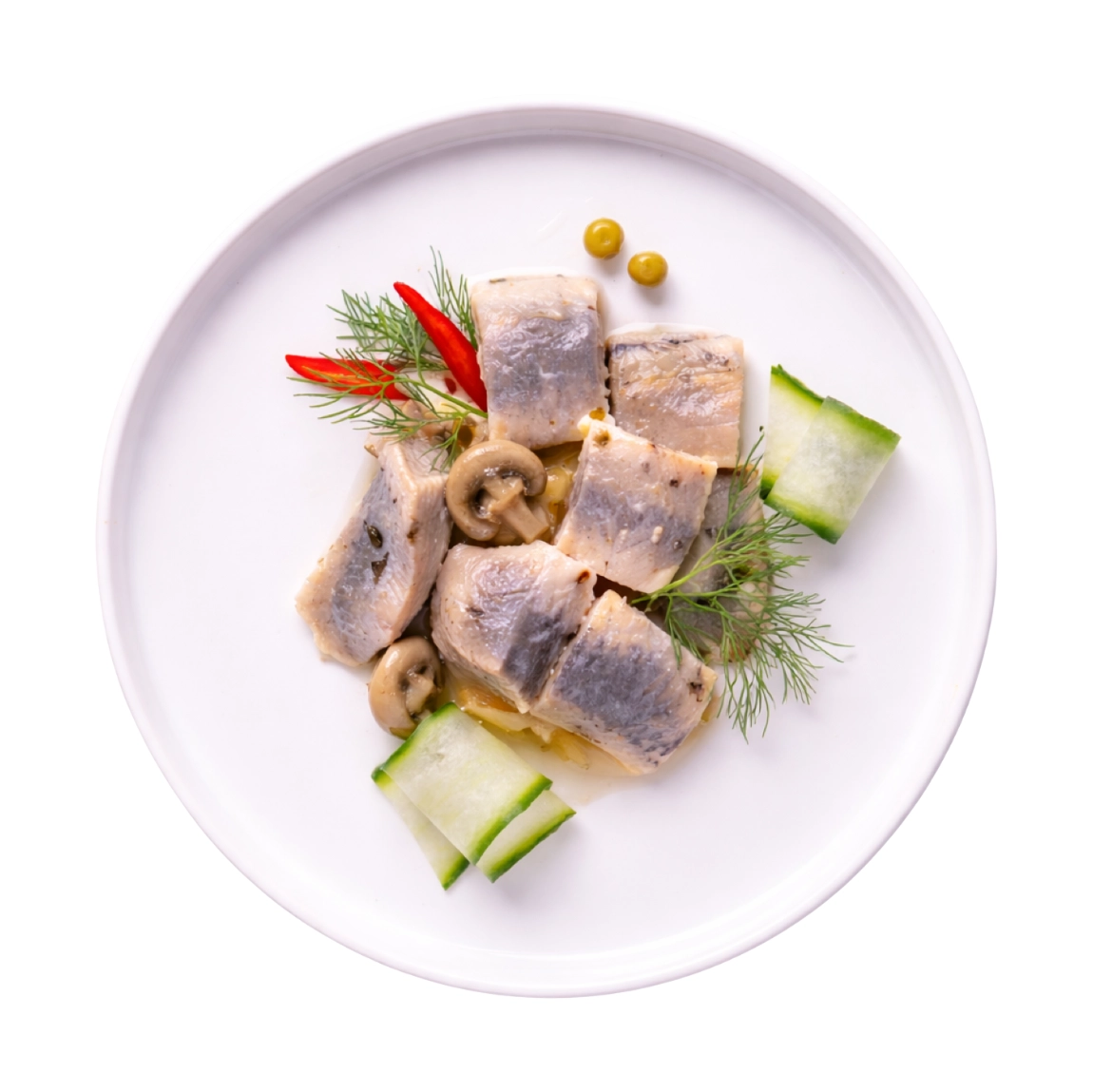 Wyrazista kompozycja smaków, w której kawałki filetów śledzia atlantyckiego (48%) łączą się z różnorodnymi warzywami marynowanymi, tworząc bogatą i harmonijną przekąskę. Delikatne mięso śledzia, poddane procesowi marynowania, zyskuje odpowiednią kruchość oraz pełnię smaku.